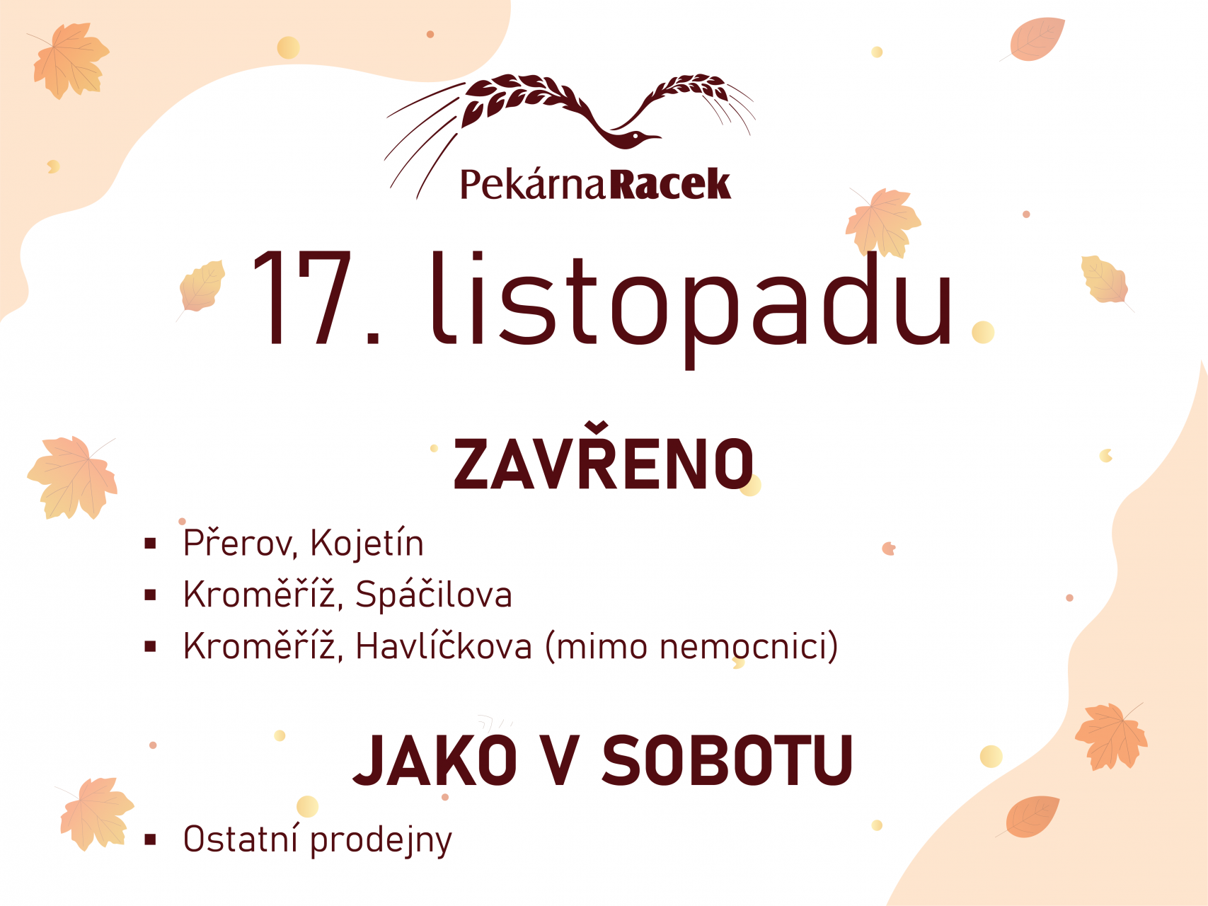 v pondělí 17. listopadu jedeme v SOBOTNÍM provozu.